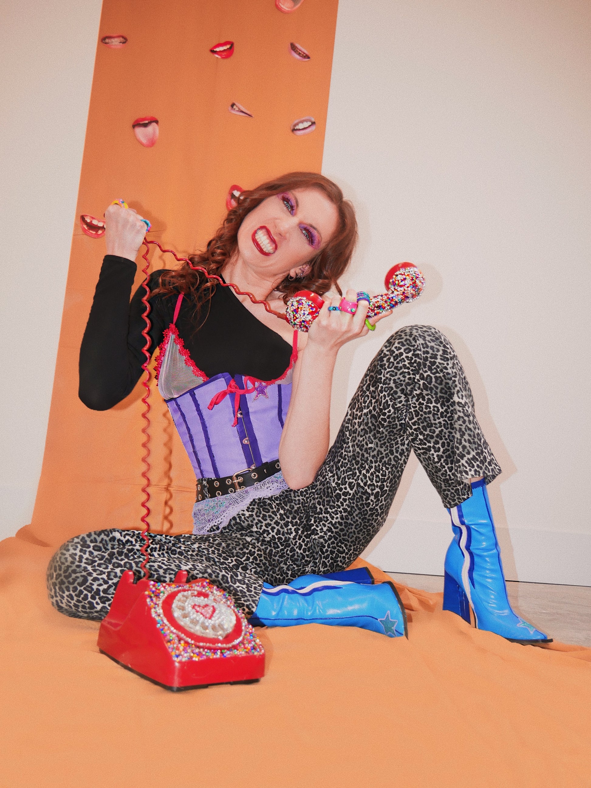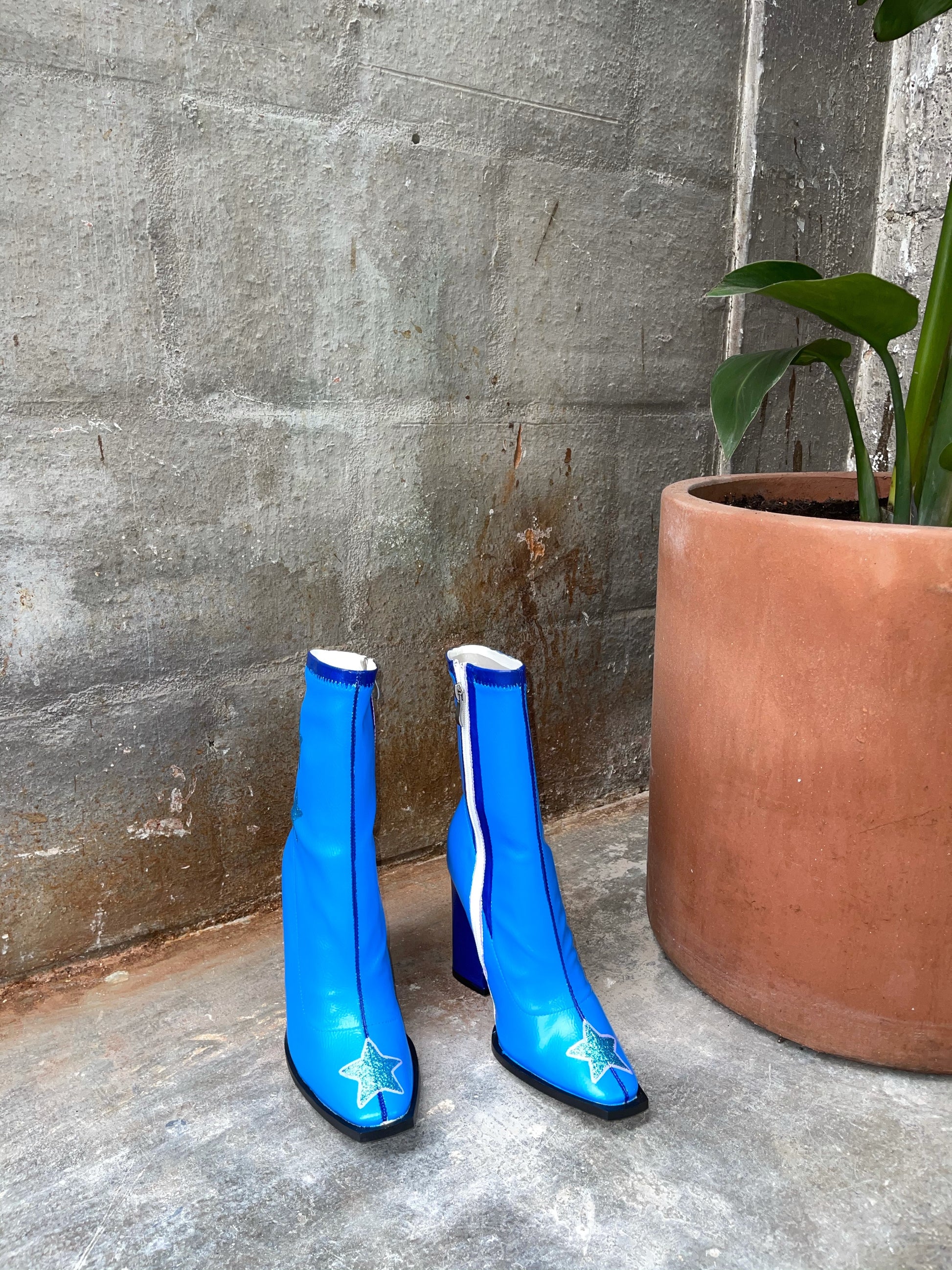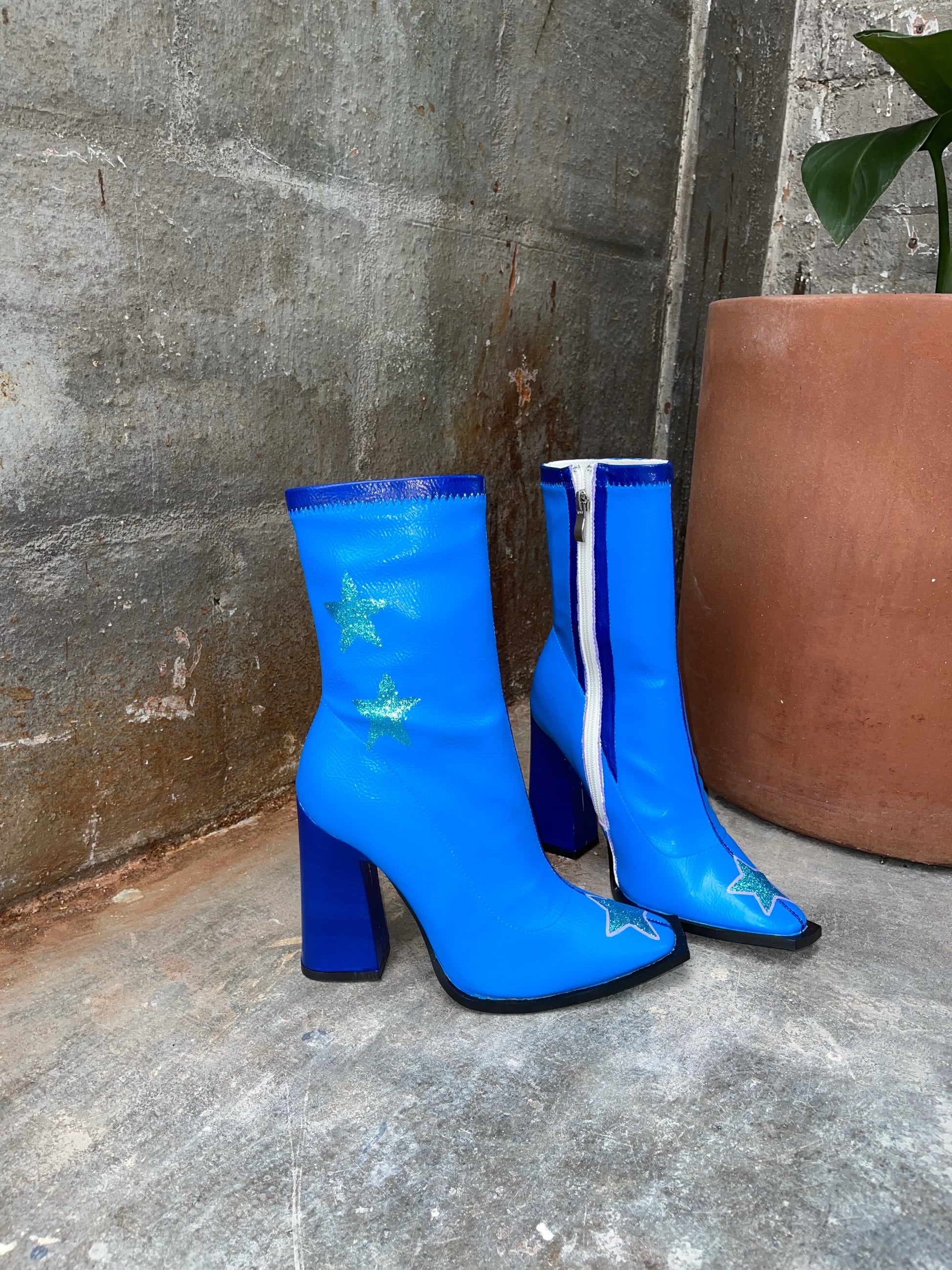 Completely hand painted modern go go boot sky and sapphire blue. Blue glitter stars with violet trimming on the toe and side of boots.