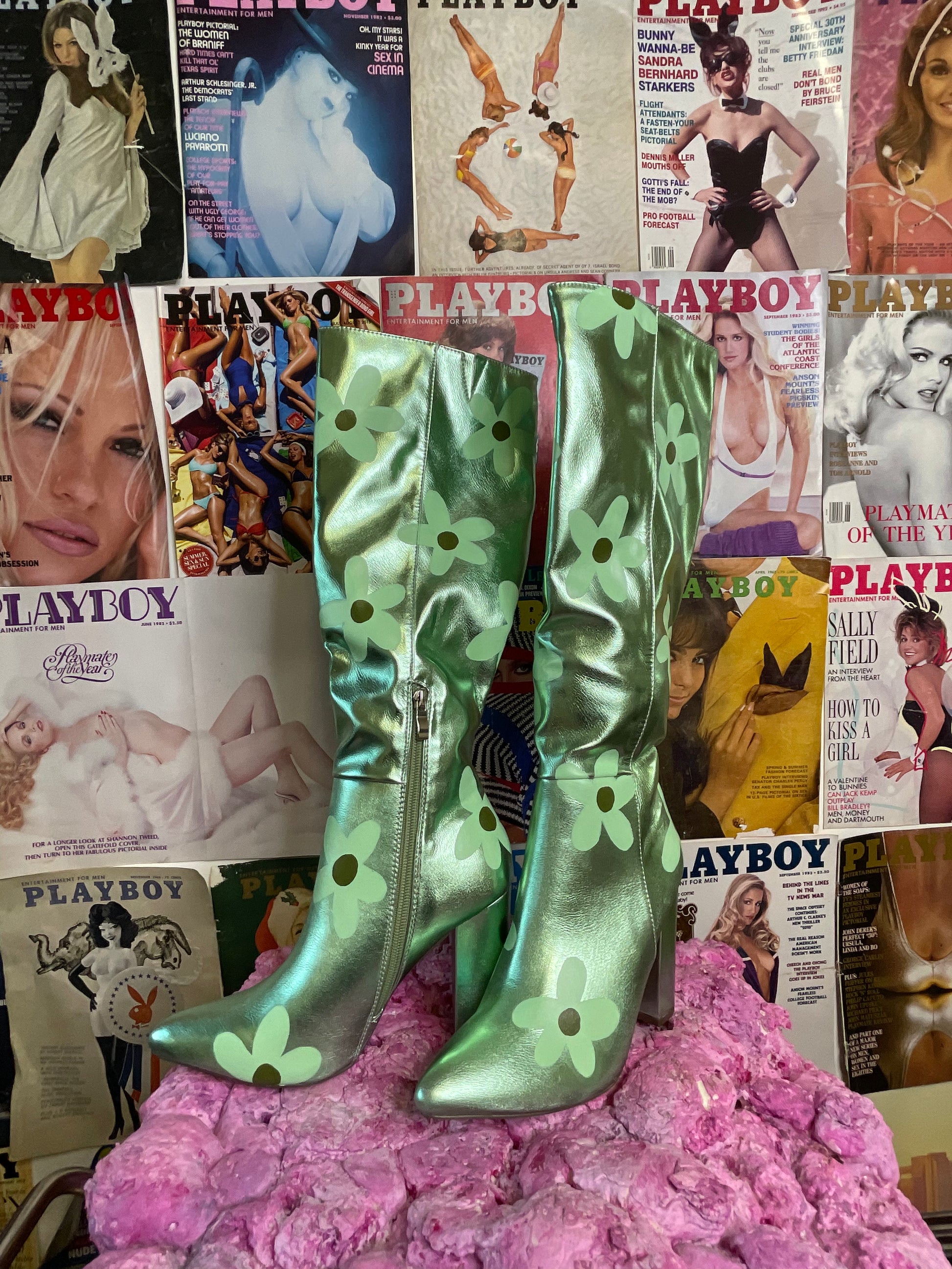 Shiny green shin high boots, hand painted with mint daisies and muted green centres. A statement boot perfect for the sunshine on its way! Dress these all the way up.