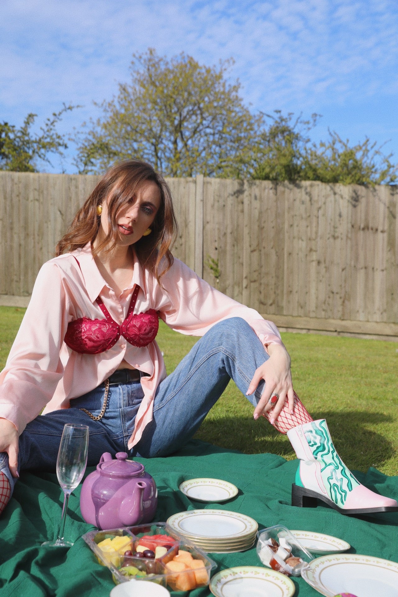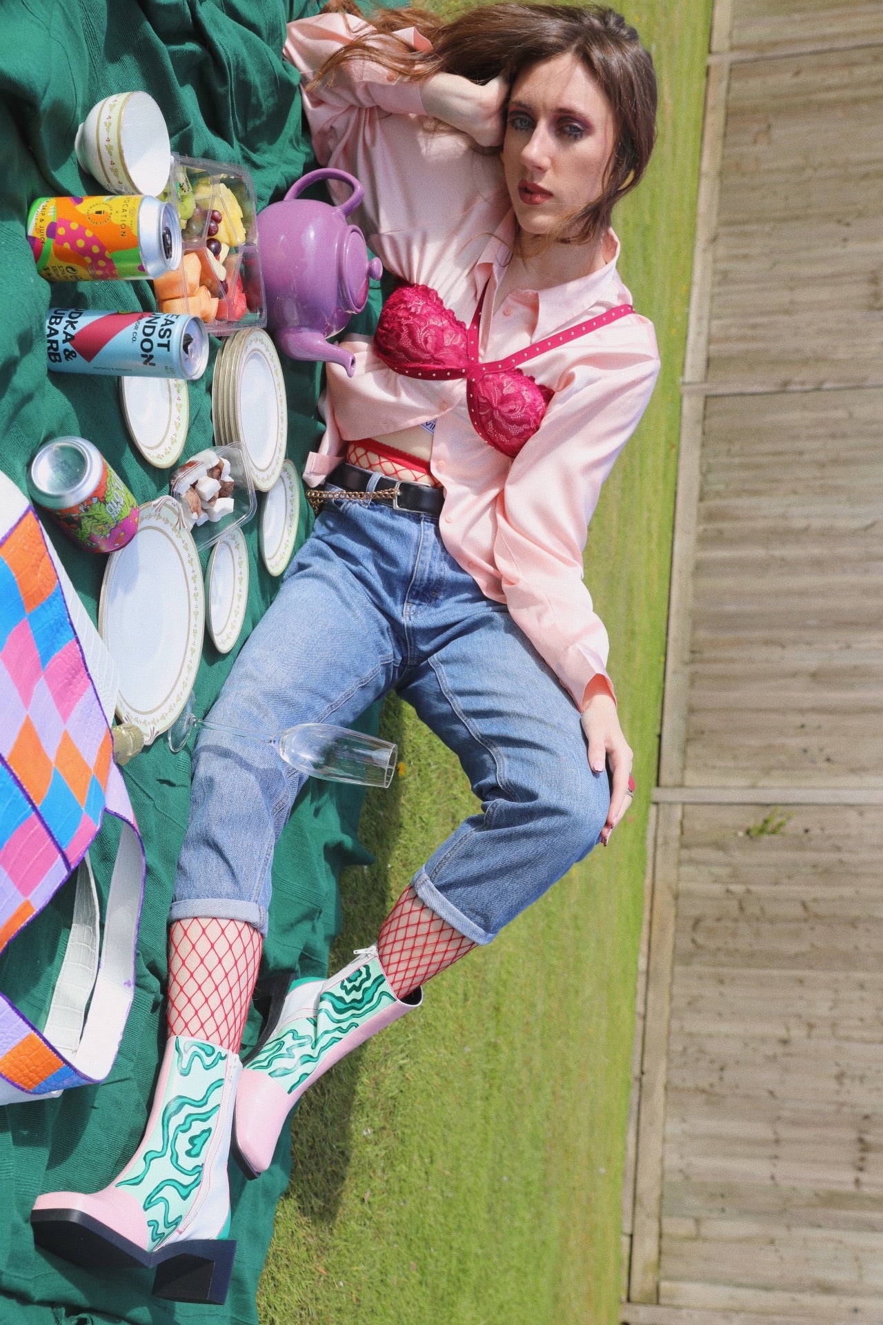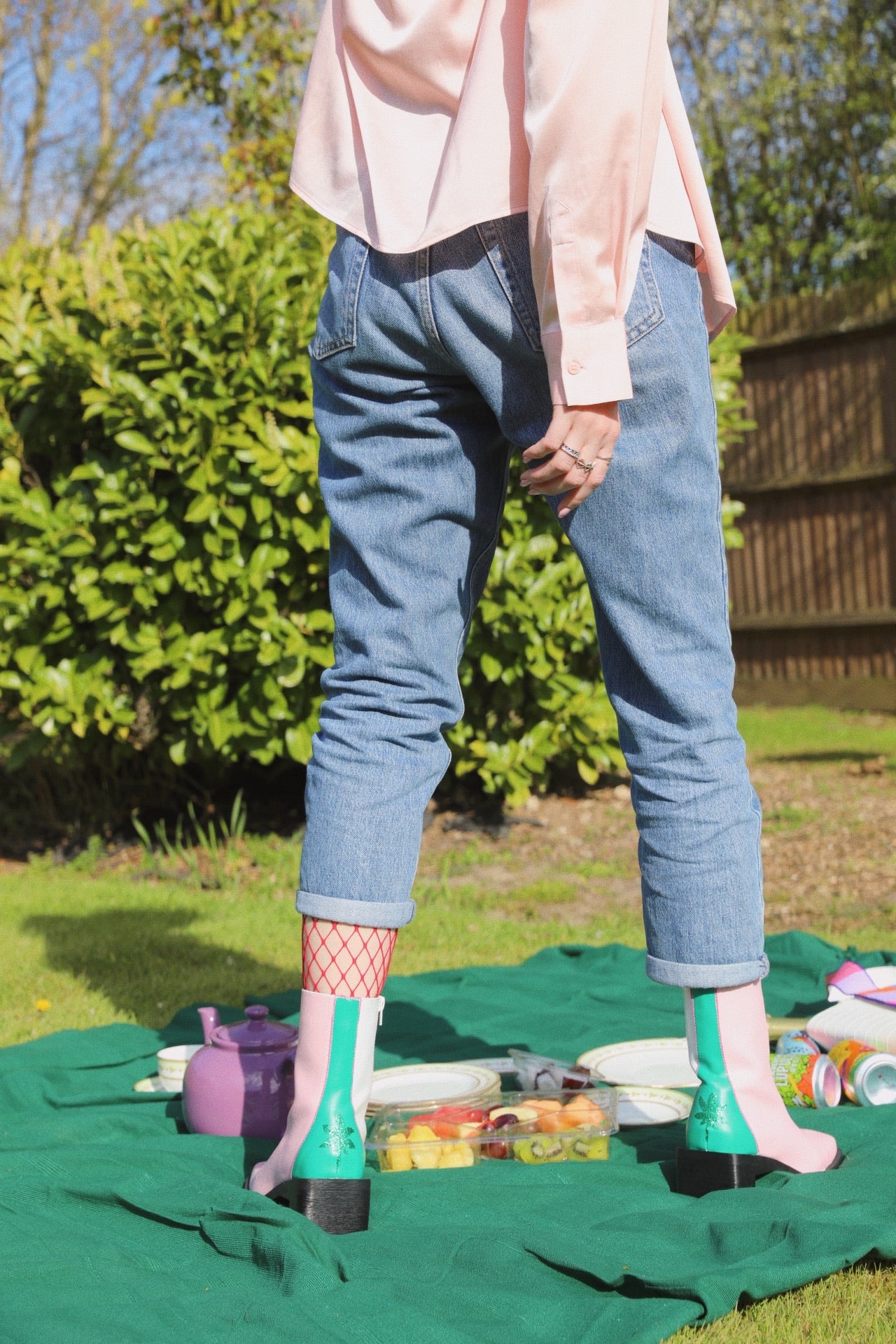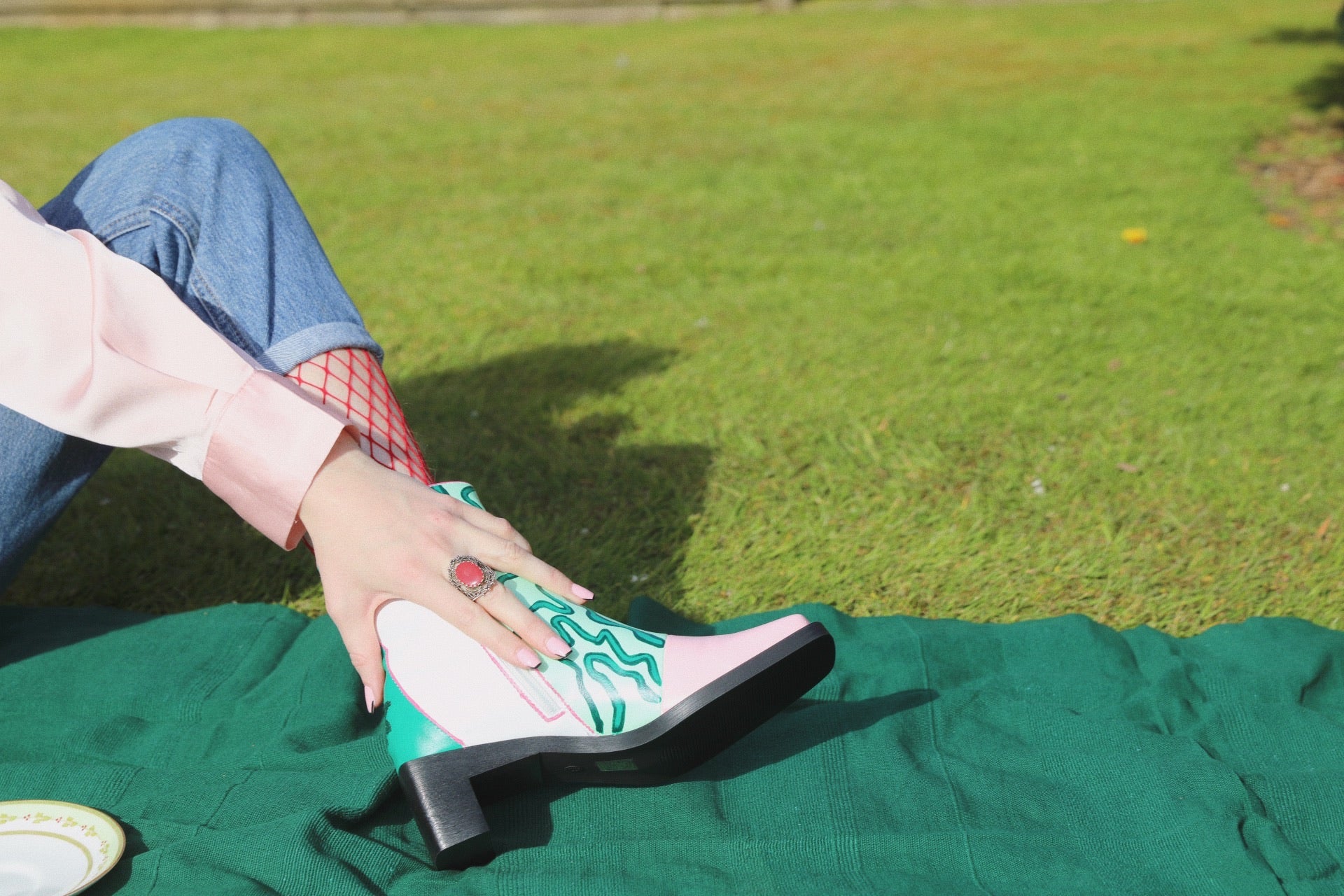 Happy 4/20! A little something I did for a Woodstock tribute if you’re picking up what I’m putting down. Hand mixed blush pink to contrast with a multi hued green pattern. Shag boots complete with a green glitter leaf painted on the back. Hot pink half trim