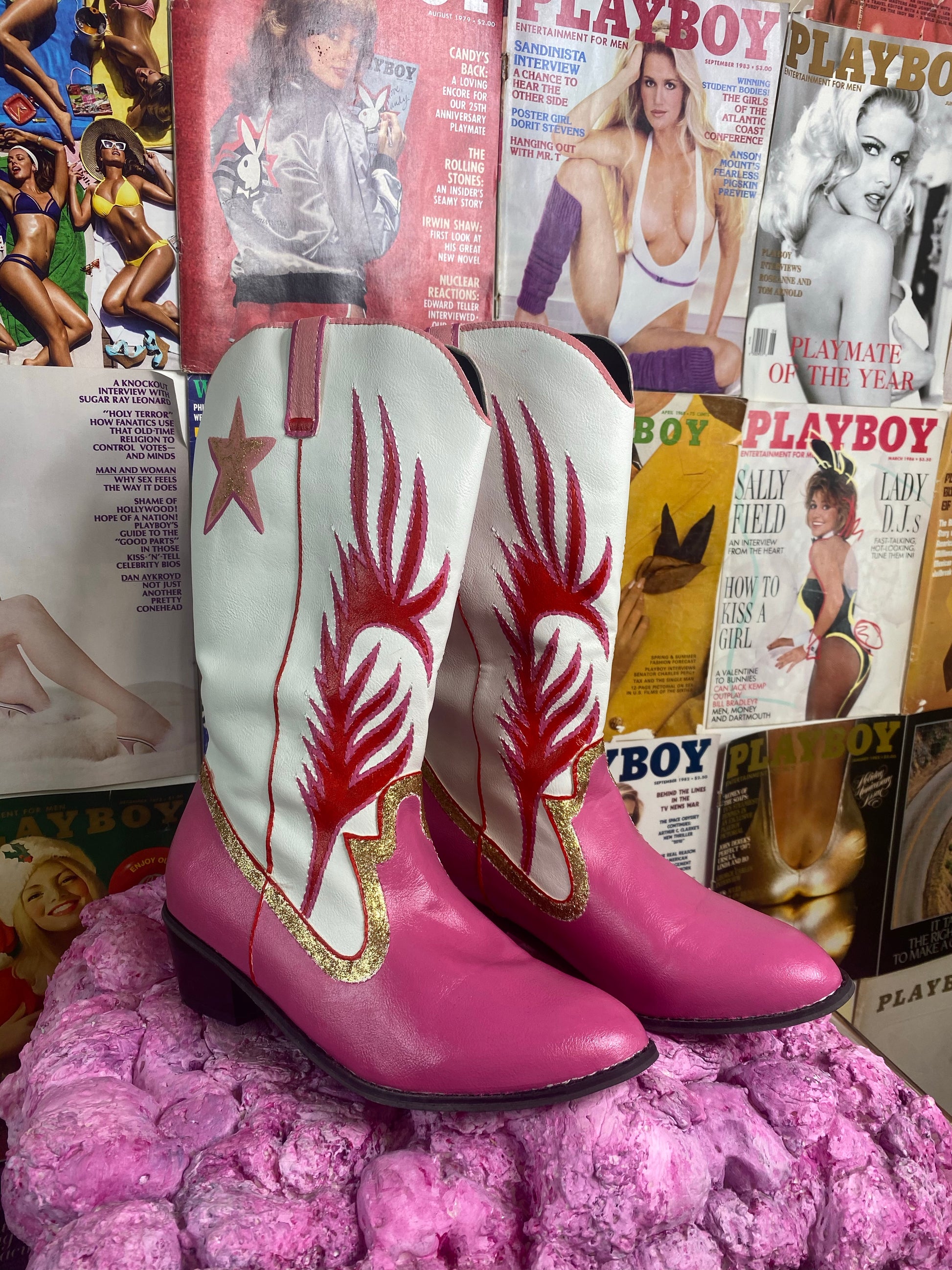 Hot pink and fire red, spicy cowboy boots! Gold glitter detailing with stars hand painted on the sides. Yeeehawwww!