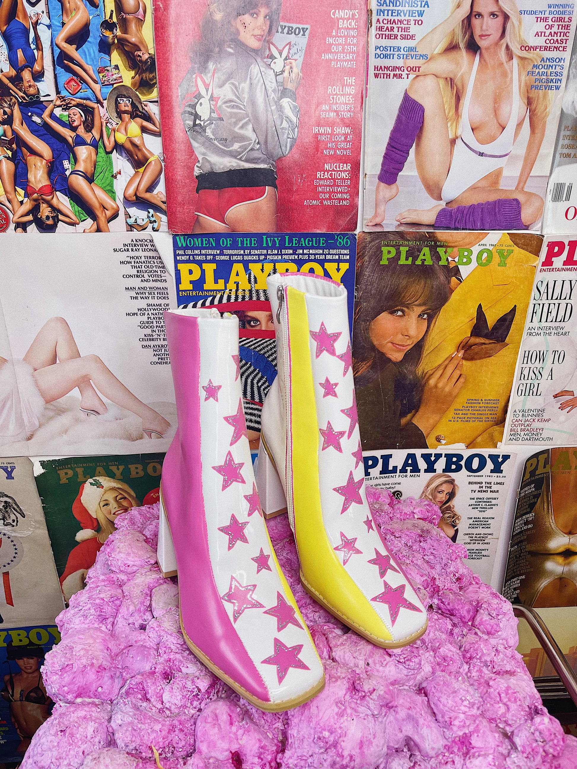 These modern go go boots are hand painted hot pink and pale yellow. Hot pink star decals running up the front of the boot, with some glitter moments as well!