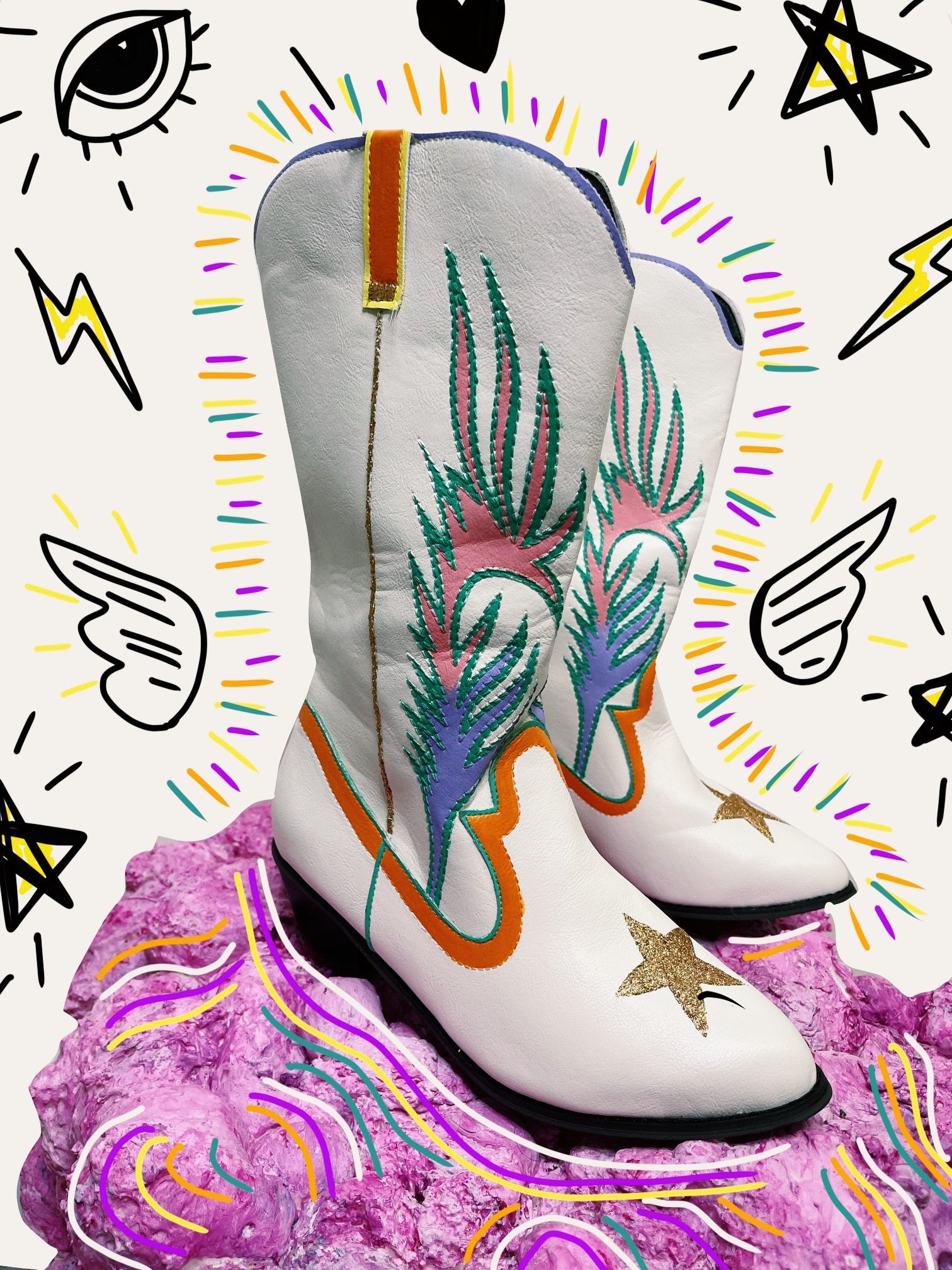 Get your daily dose of rainbow, these cowboy boots come decked out in lilac, tangerine, petal pink, and hand mixed turquoise. Cherry on top, gold glitter stars on the toe.