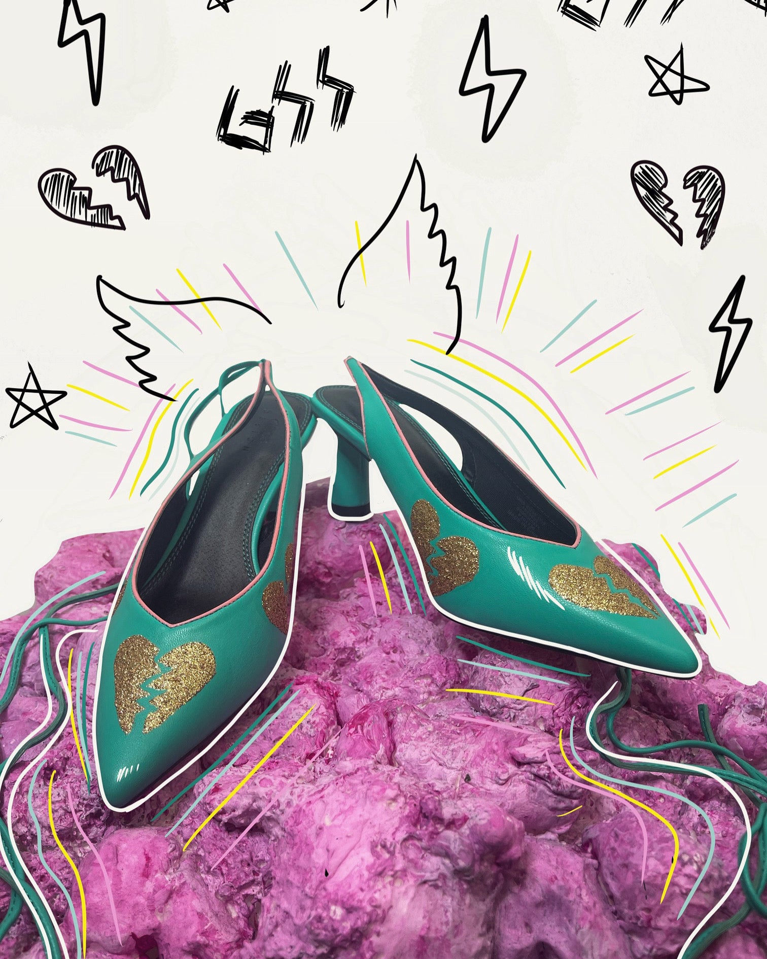 Turquoise tie up heels with hand painted gold glitter broken heart decals, petal pink trim. (the white graphic is not painted on the shoe.)