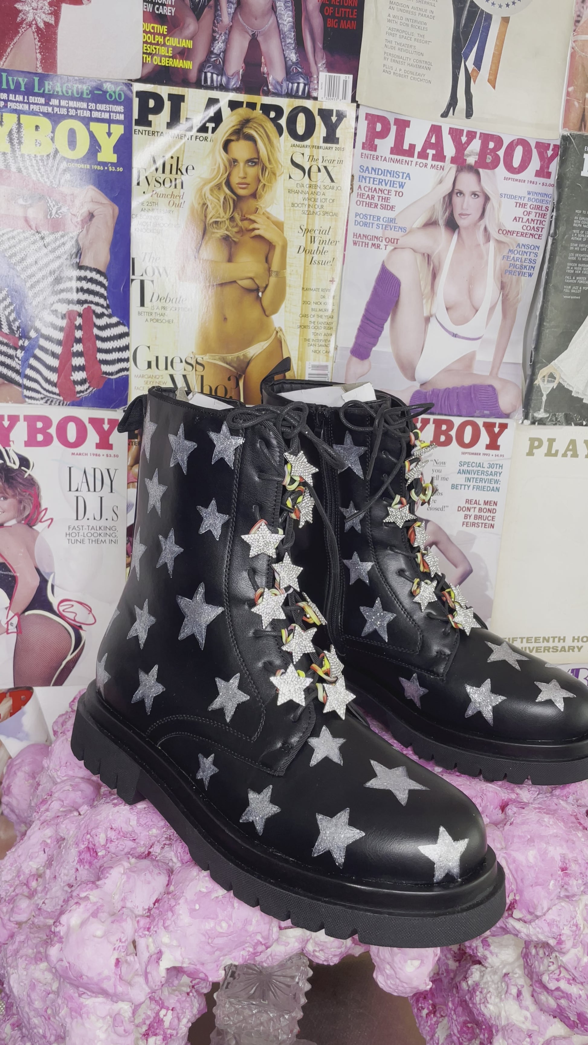 The next step in custom order “menswear” for girlscoutshoes, available in sizes all the way up to UK 12, US 14. Black combat boots hand painted with sliver stars, topped with glitter and seal top coat on each star. The real show stopper on this piece being the sliver lace charms designed by @4Kix , completely removable and therefore can be used on any trainer or shoe in your collection!