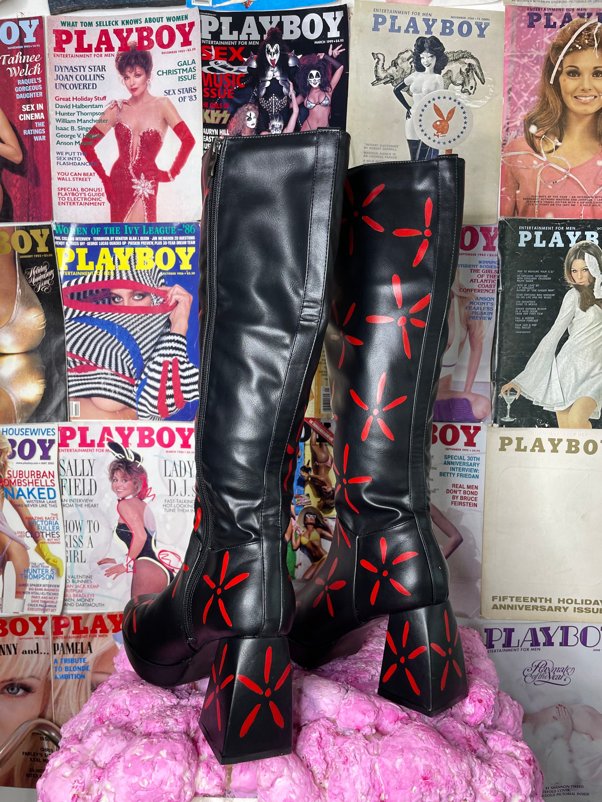 Chunky heeled black knee high boots, hand painted with a minimalistic yet eye catching spark print. Carefully primed wearable art, detailed with fire red abstract floral, or celestial print. Can be dressed up with layered accessories and contrasting prints, or styled with a simple black or red dress to have all the focus on your new custom knee highs!