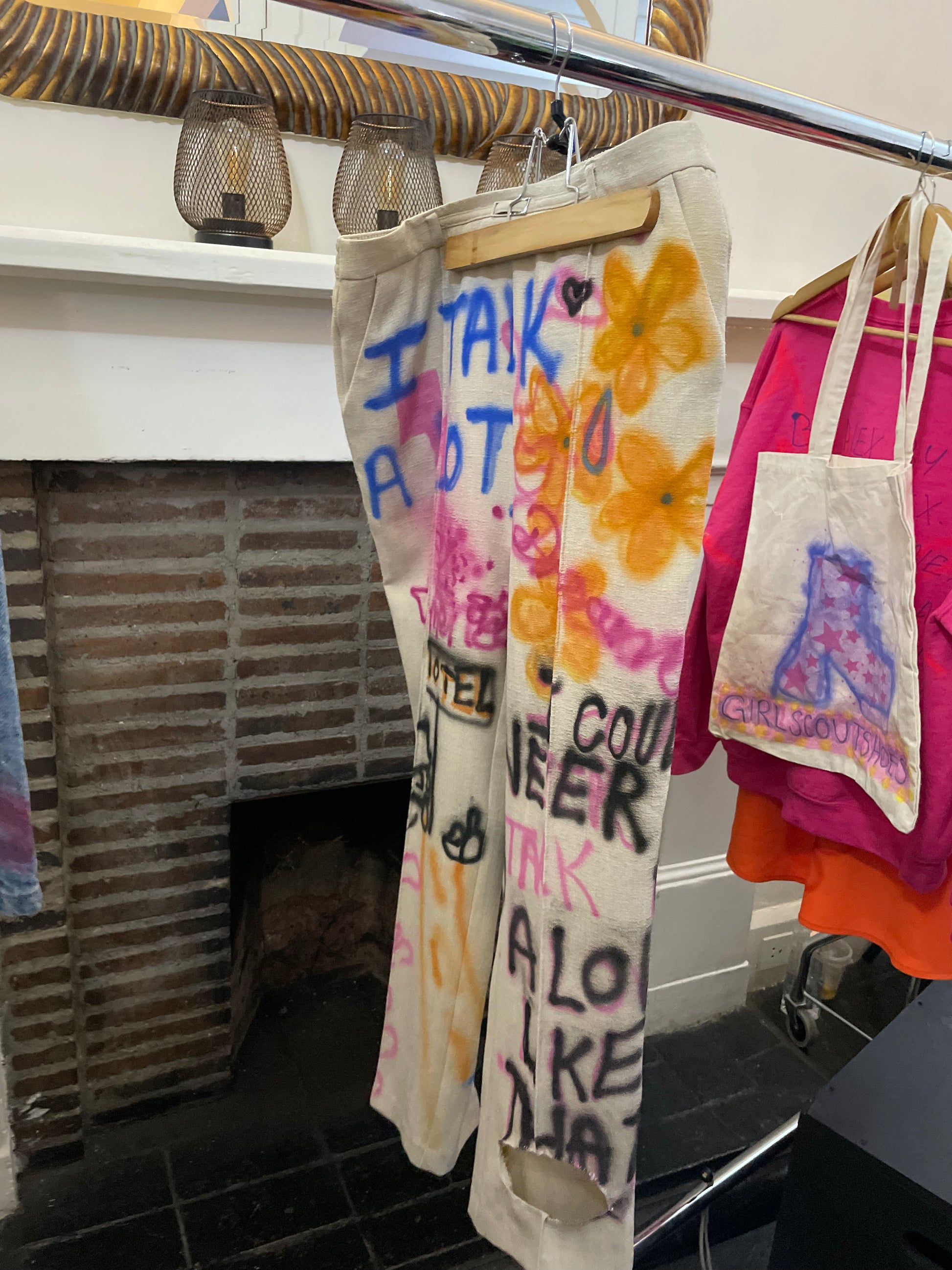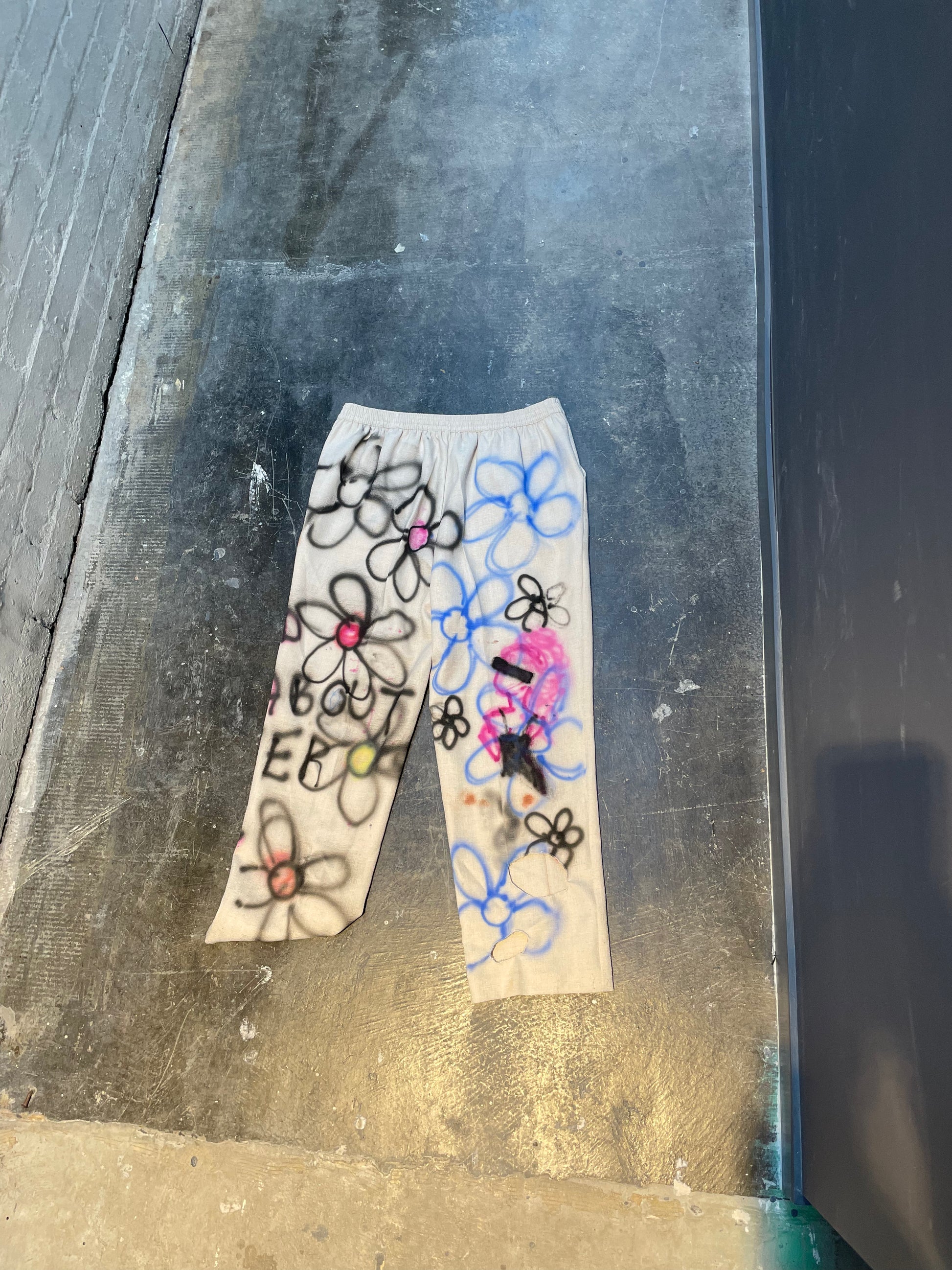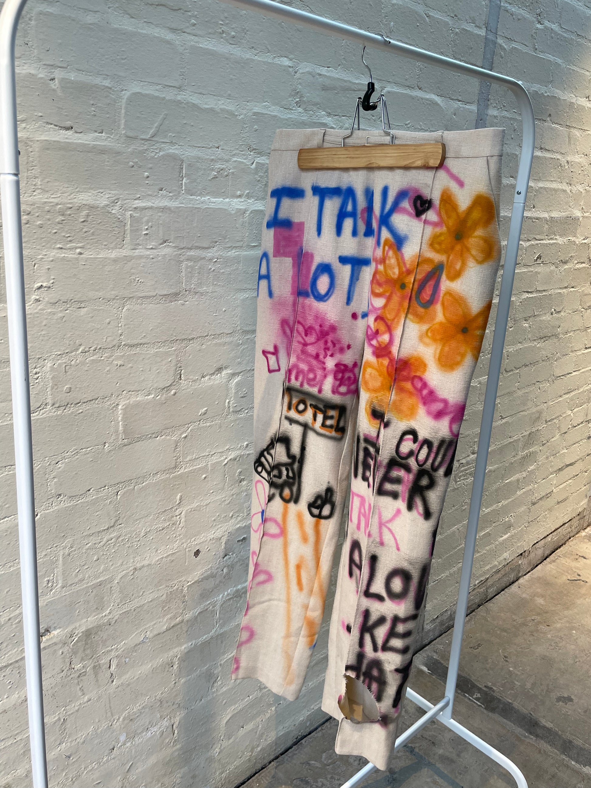 Beige vintage trousers hand airbrushed with a clutter of illustrations. Using sapphire blue, pink, black, and orange, they were sprayed to be a street style moment. Eye cut out by the ankle to show off statement knee high boot.