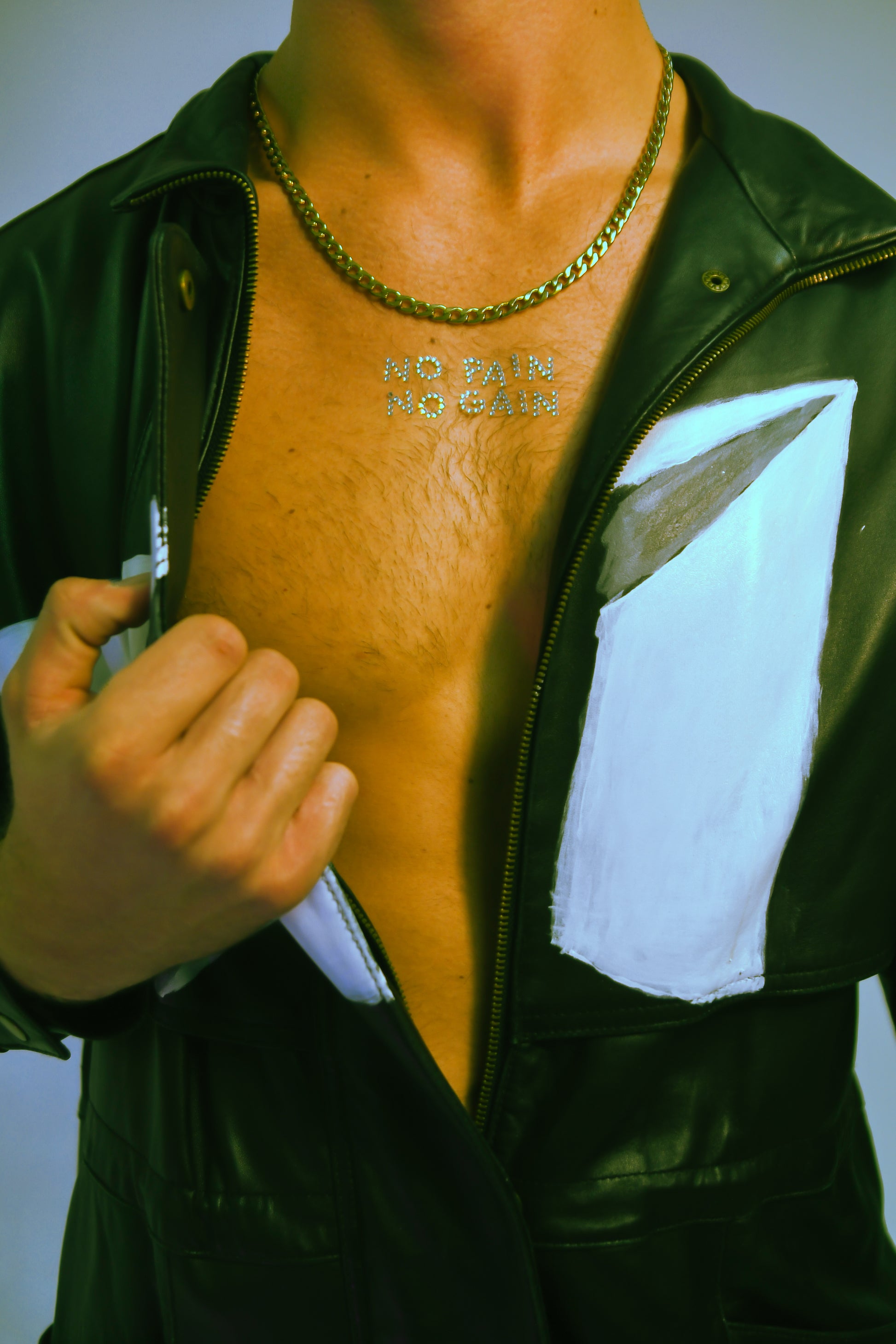 Thrifted leather jacket up cycled with iconic WTKAI hand painted paper airplane design on centre front, accompanied by lucky numbers “96” detailed in metallic sliver on the back. Super unique silhouette of double panel vertically and horizontally layered through jacket